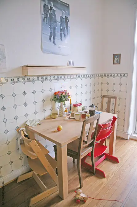 Ist nicht viel Platz in dieser Hamburger Küche, aber mittels einer Ansteckplatte (unsichtbar befestigt) und dem Rausziehen des Tisches, kann man auch mal Gäste köstlich bewirten. Den klassischen Besteckschub haben wir zugunsten der Beinfreiheit als Klappkasten an die Wand geschraubt. So können nicht nur die Kinder wesentlich besser sitzen, die Klappe ist auch bei vollbesetztem Tisch immer zugänglich.