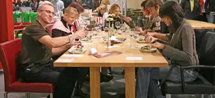 Günther Dürr vom gleichnamigen Weingut (vorne links) genießt das kosteliche Essen, das Diana Burkel vom Würzhaus Nürnberg zubereitet hat