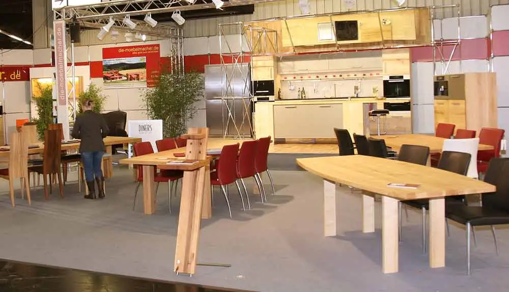 Auf der Consumenta sind unsere Tische nicht nur Ausstellungsstücke, sondern immer auch Testessertafeln oder aus anderen Gründen in Beschlag. So sieht man nicht nur, wie der Tisch aussieht, sondern auch, dass er zum Benutzen gemacht ist. Denn nach jeder Show wird nass drübergewischt. Die geölten Oberflächen haben mit roter Beete, Rotwein und Blaukraut kein Problem und sogar den Eddingstift, den wir zur Präsentation immer verwenden, können wir mit wenigen Handgriffen entfernen.