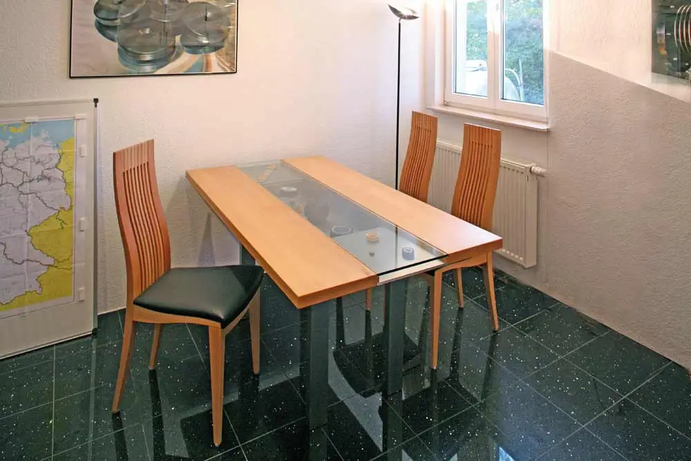 Unser Meister Stefan hat geheiratet und heißt jetzt nicht mehr Rasswornigg sondern Winter. Sein Esstisch hat Ansteckplatten, die drei Feldfüllungen sind aus Beton. Wir wissen in der Zwischenzeit, dass seine Frau Nina schöne Tischdecken mag, was einem Möbelbauer zwar ein wenig weh tut, aber wenigstens auf dem Foto ist ja keine drauf.