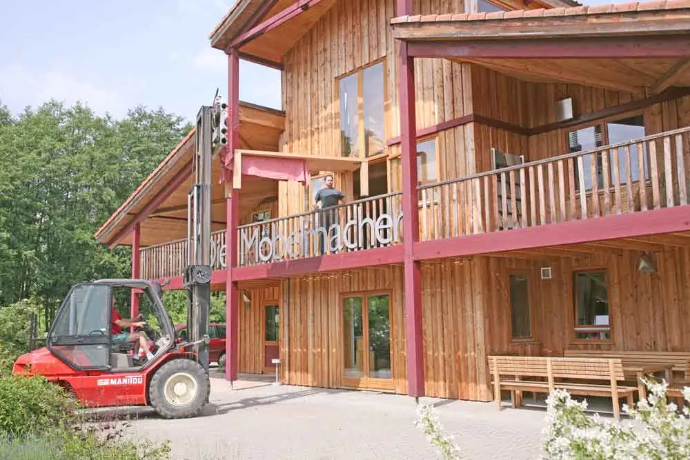 Es war natürlich ein Weblogeintrag unter der Rubrik Lächeln und auch sonst war die Fotoaktion anlässlich der Tischauslieferung ganz lustig. Der schwere Tisch mit fast 7 cm dicker Platte passt einfach ausgezeichnet zu unserem dicken Gabelstapler.