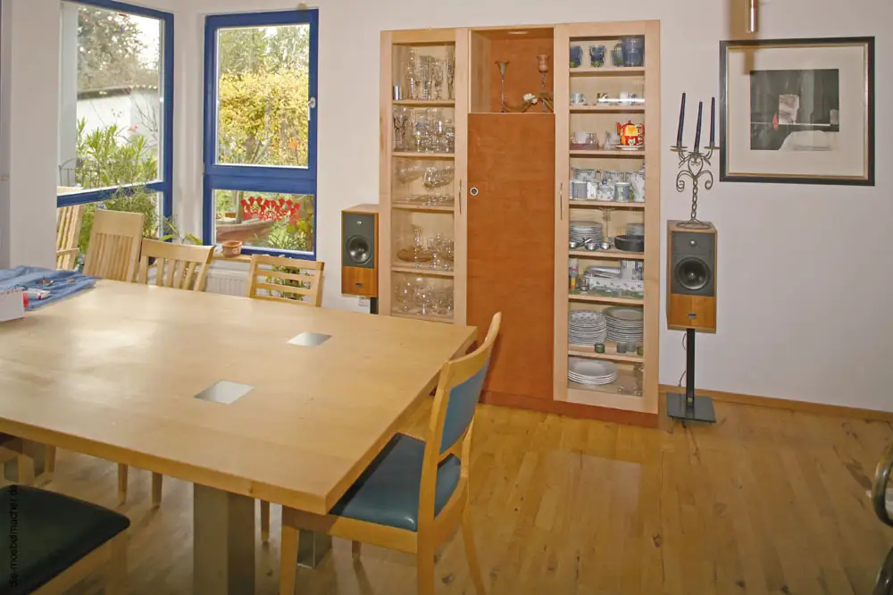 Der passende Geschirrschrank für den das Glas in der Farbe der Stühle pulverbeschichtet wurde