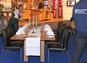 Weinprinzessin Michaela die erste schenkt den Gästen beim Bayerischen Rundfunk reinen Wein ein - den Buchen Massivholz Tisch hat Christian Wonka vom Restaurant Wonka festlich gedeckt