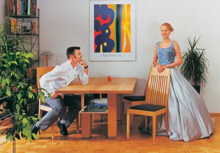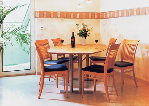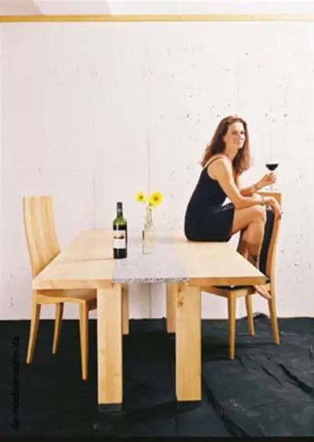 Der Essplatz zum Wohnzimmer in Kirschbaum . Das leichte Edelstahlgestell trägt die Kirschbaumplatte (da sie nicht so hart wie Buche oder Ahorn ist, sollten sich übrigens nur gesittet speisende Paare dafür entscheiden). Die Stühle sind von Potocco.
