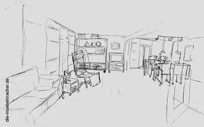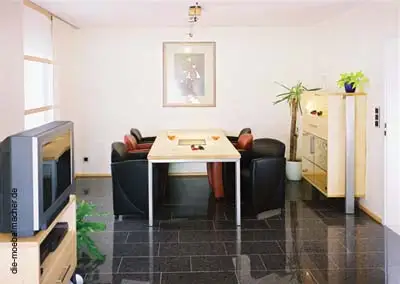 Nicht jede Familie möchte Wohnzimmer, Essplatz und Küche als einen einzigen Raum haben, aber für die, denen es gefällt ist es das Höchste. Die Verlegeart der Solnhofer Platten strukturiert den großen Raum, durch den man von Marlens Arbeitsplatz im Möbelmacherbüro bis auf den Acker hinter dem regionalen Musterhaus schauen kann.