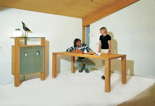 Das Ofenhaus Dörfler (Bernhard links) und die Möbelmacher (Ute rechts) verbindet nicht nur die Vorliebe für schlichte Formen und ehrliche Materialien, sondern auch die individuelle Beratung und die gute Beziehung zu den Kunden. Es ist sicher kein Zufall, dass wir jede Menge gemeinsame Kunden entdecken und dass der Tisch und die Vitrine aus der Laufer Roteiche zur intensiveren Zusammenarbeit inspirierte.