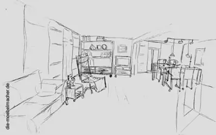 Edel wirkt dieser Essplatz aus Ahorn und Edelstahl vor allem wegen der Bridgesessel von Jori, vor denen wir nur warnen können, weil die Gäste erst gegen 3 Uhr morgens das erste Mal auf die Uhr schauen. Die kleine Zeichnung zeigt die Entstehungsgeschichte während des ersten Gesprächs, das bereits Fenster und Beleuchtung mit einbezieht.