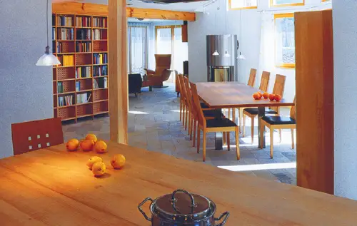 Wohnzimmer - Essplatz - Küche: Sofa und Sessel von Jori, Stühle Novella von Längle & Hagspiel, gepolstert mit pflanzlich gegerbtem Leder Ecopell, Ofensäule von Ofenbau Dörfler, Licht über Esstisch von Sigl-Licht, Bücher von der Buchhandlung Lösch.