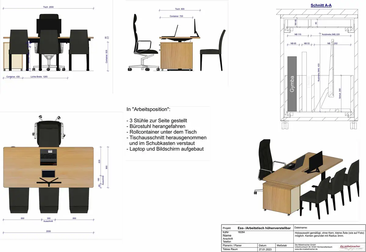 Dass wir eine Küche höhenverstellbar herstellen können, dass Schreibtische höhenverstellbar sind und sogar Stehtische oder -pulte diese Funktion beherrschen, hat sich, oder haben wir schon rumgesprochen. Vergleichsweise unbekannt sind aber höhenverstellbare Esstische. Das Esstischbeispiel auf Rollen hat im Zentrum eine mit Magnet abnehmbare Holzabdeckung über den Steckdosen und Netzteilen. Wenn die Stühle drumrumstehen, käme kein Gast auf die Doppelfunktion als höhenverstellbarer Arbeitsplatz, weil der Schreibtisch-Roll-Container unauffällig in der Nähe geparkt werden kann.