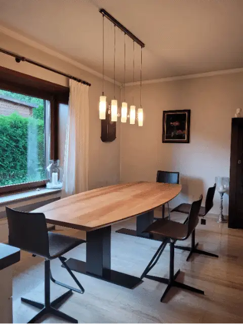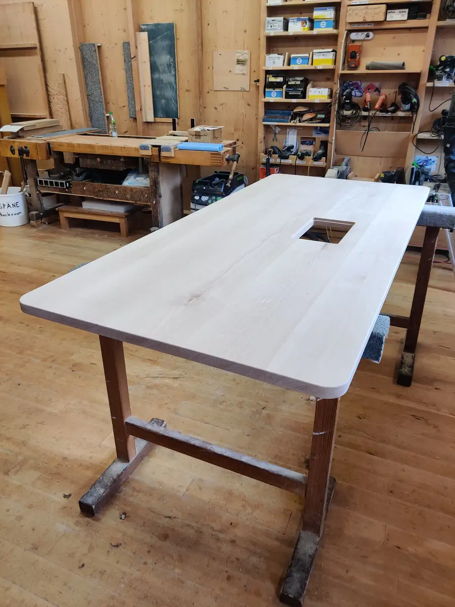 Hier mal ein paar Fotos von der Fertigung vom rohen Brett bis zum höhenverstellbaren Esstisch mit Schreibtischfunktion und Rollcontainer.