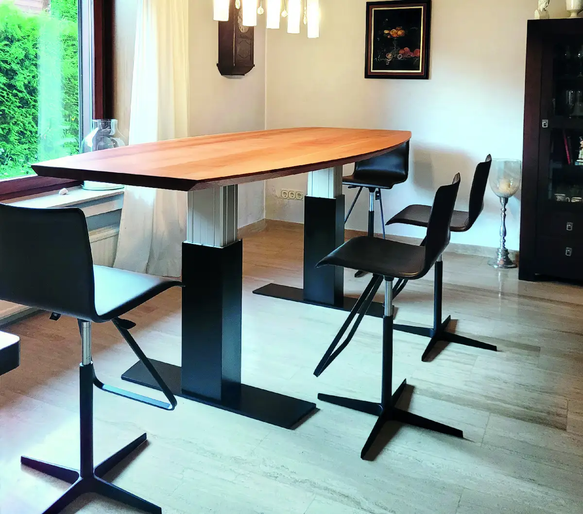 Dieser höhenverstellbare Ess- und/oder Konferenztisch hat einen eingebauten Kabelroller, ähnlich dem in Ihrem Staubsauger, also kann man ihn mit einem Griff an den Strom anschließen und auf die passende Höhe fahren. Alternativ wäre auch ein Akkubetrieb möglich. Die höhenverstellbaren Stühle dazu passen vom Esstisch bis zum Sektempfang oder – wie bei unserem Kunden – zu kleinen Konferenzen oder Vorstandssitzungen, die in stehenden Positionen wesentlich schneller vorübergehen, als im Sitzen. Egal, ob Schreibtisch, Stehtisch, Küche, Esstisch oder Montageplatz, alles verstellen wir mit den Hubsäulen von LINAK.