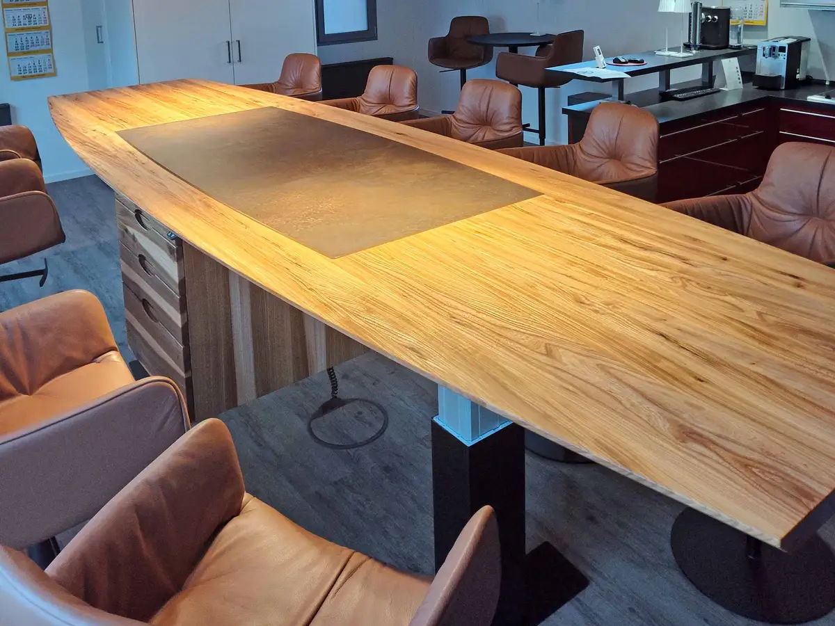 Höhenverstellbarer Konferenztisch mit integriertem Kochfeld