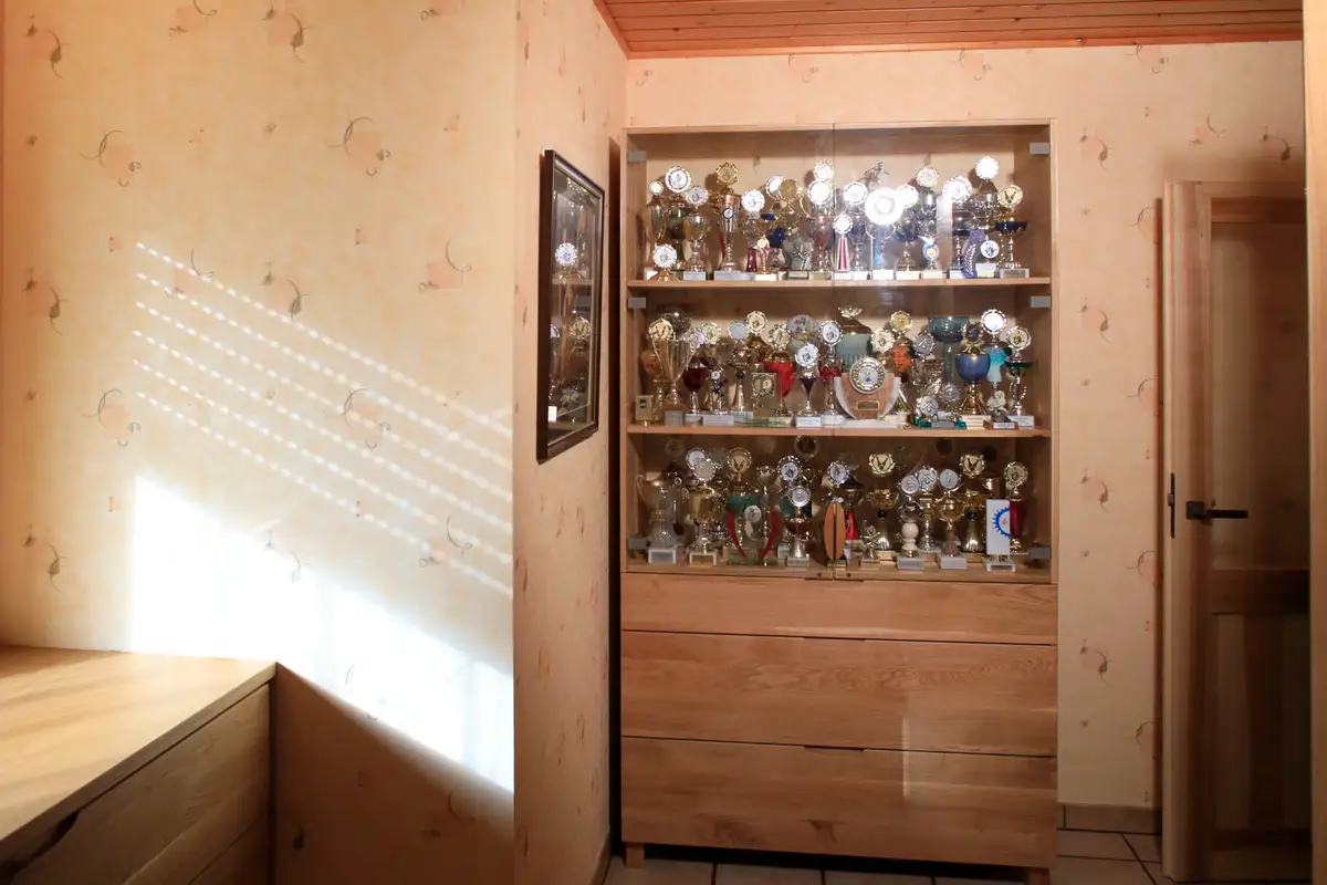 Klarglasvitrine für die sportlichen Erfolge, darunter Stauraum in Schüben