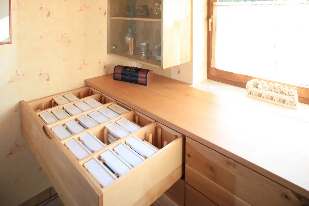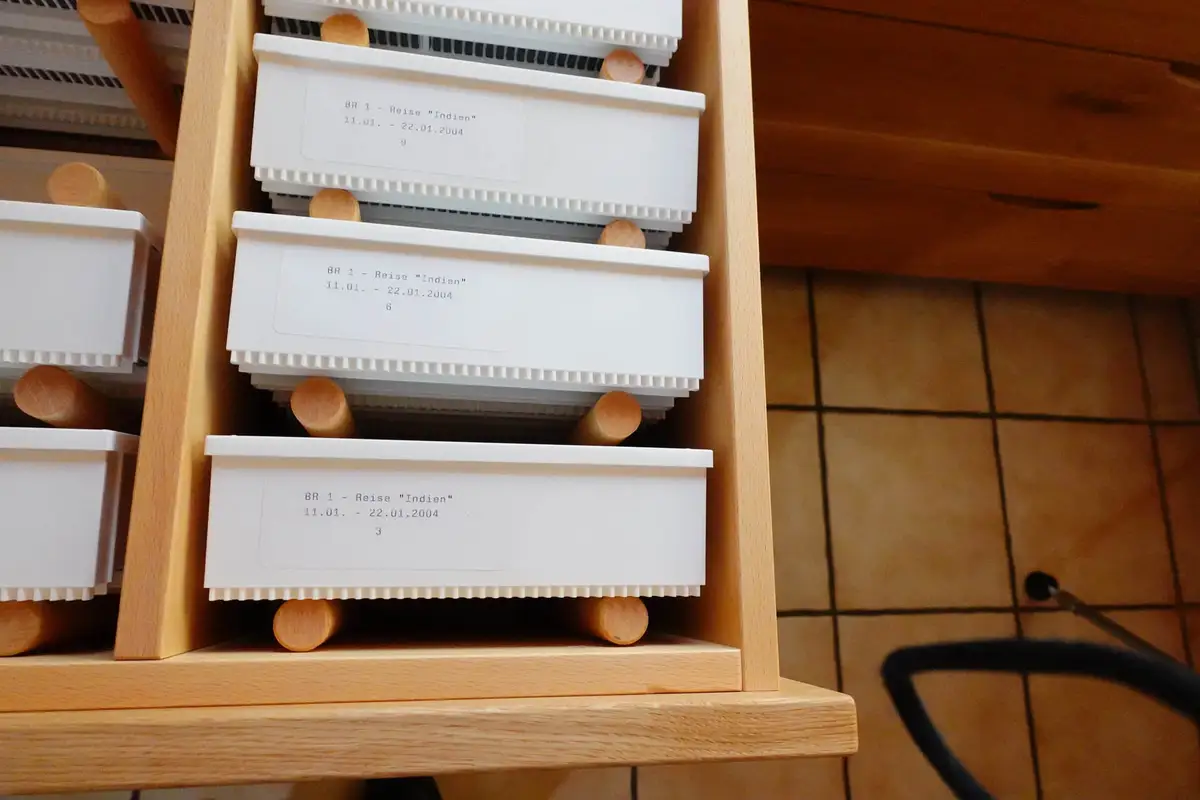 Spezialschubladen, mit einigen tausend Dias wurden raffiniert eingerichtet, um optimal zugreifen zu können