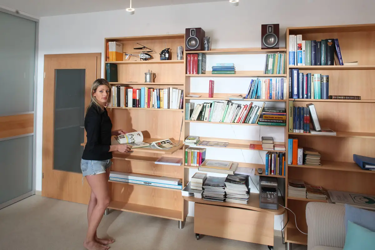 Für Frau Dr. Bräu-Dümler (Arbeitsmedizinische Praxis AMZ) und ihren stets fotografierenden Mann durften wir ausreichend Stauraum für einige tausend Diapositive schaffen, so nannte man damals Fotos, die in Laboren entwickelt und in Rahmen gepackt wurden, die man mittels Diaprojektor auf die Leinwand projizieren konnte. Und weil die beiden das Betrachten derselben auch heute noch schätzen, wurde jetzt eleganter und funktionaler Stauraum dafür geschaffen. Vorher war es ein ungeliebter Abstellraum mit alten Regalen und vielen Kartons. Gleichzeitig war im Wohnzimmer nicht genügend Platz für die Fotoausrüstung nebst Dias, die die Urlaube und das Leben der Familie widerspiegeln. Zusätzlich sollten die Pokale und Orden aus sportlicher Vergangenheit einen würdigen Platz bekommen und es musste Arbeitsfläche zum Pflegen der Diasammlung vorhanden sein. Fotosausrüstung, Diaprojektor, natürlich die Leinwand, alles sollte endlich funktional aufgeräumt sein. Die raffinierte Schubeinteilung erlaubt das schnelle Finden und das bequeme Herausnehmen aller sorgfältig sortierter Magazine.