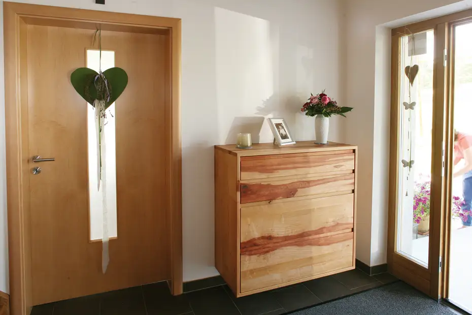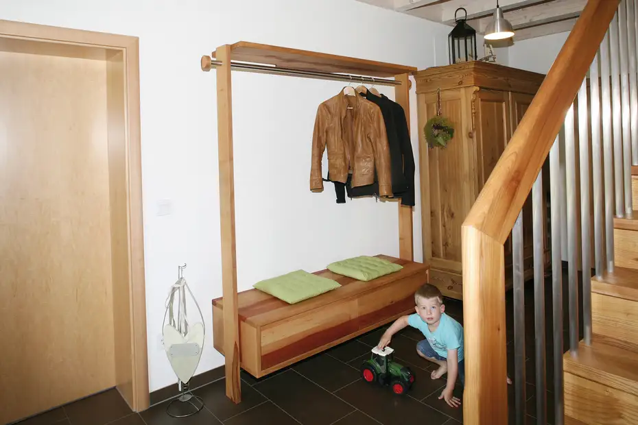 Weil im Eingangsbereich von Familie Schörner viele Traktoren unterwegs sind ‒ und weil es auch angenehmer zu wischen ist, haben wir die Garderobe aus fränkischem Birnbaum größtenteils an der Wand befestigt. Wir sind beeindruckt, wie viele Traktorenmarken die kleinen Fachleute schon kennen und hoffen auf ähnliches Markenbewusstsein bei den Möblern.
