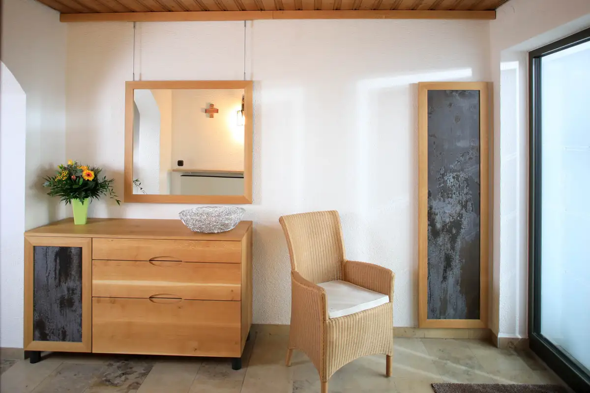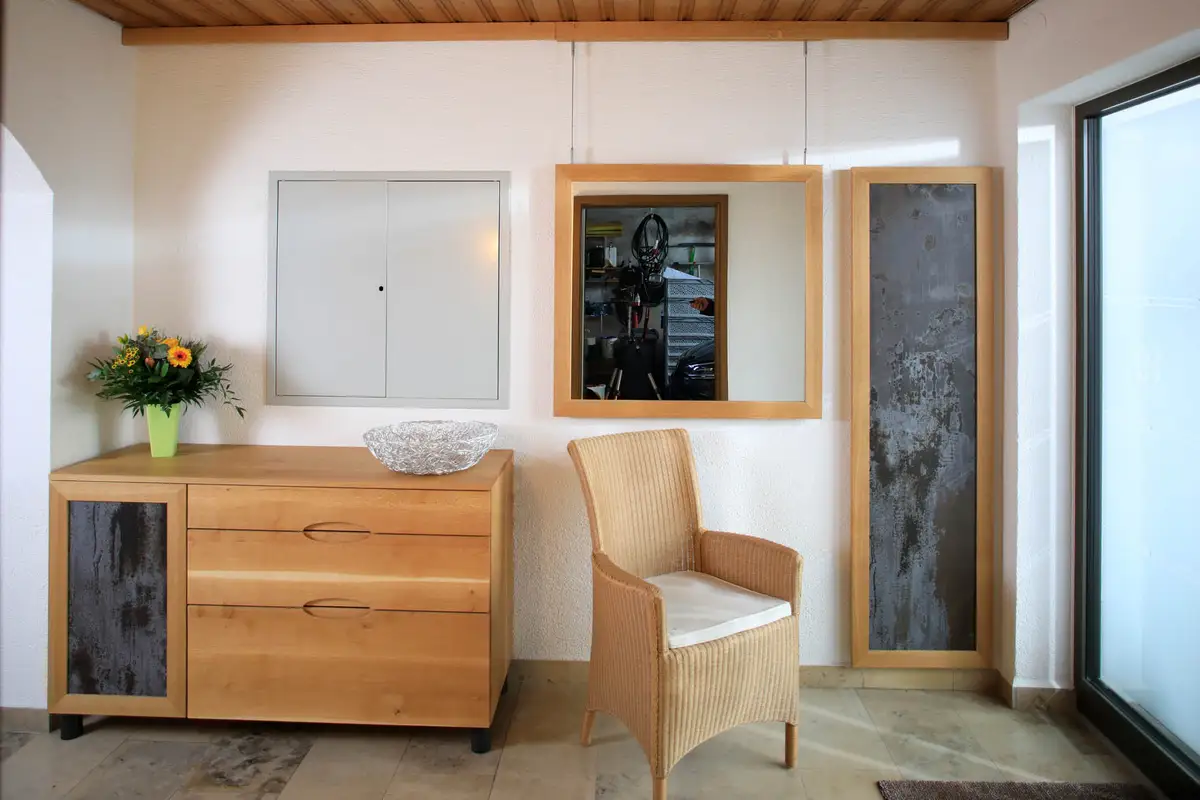 Rechts neben dem Spiegel verdeckt eine polierte, magnetisierbare und leicht abnehmbare Edelstahlplatte den Sicherungskasten. Das Brett mit Baumkante verhindert die Sicht auf den Futternapf der Katze vom Wohnzimmer aus.