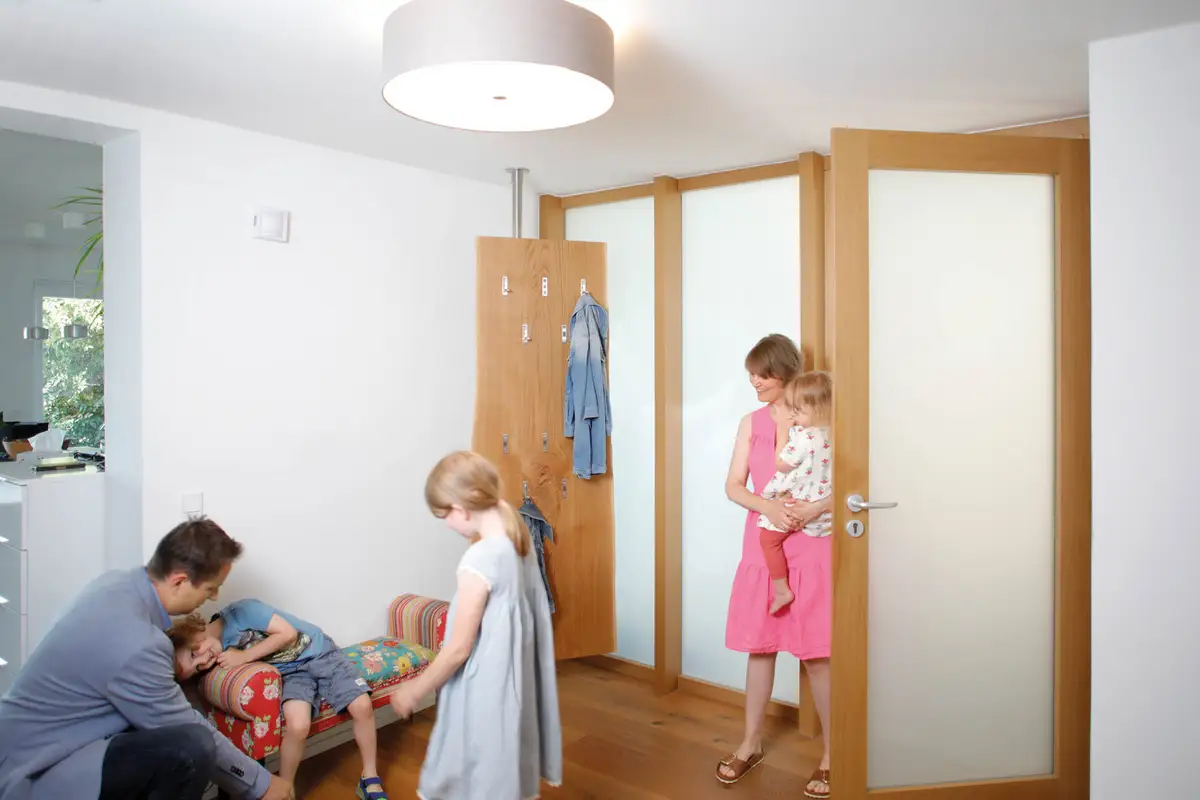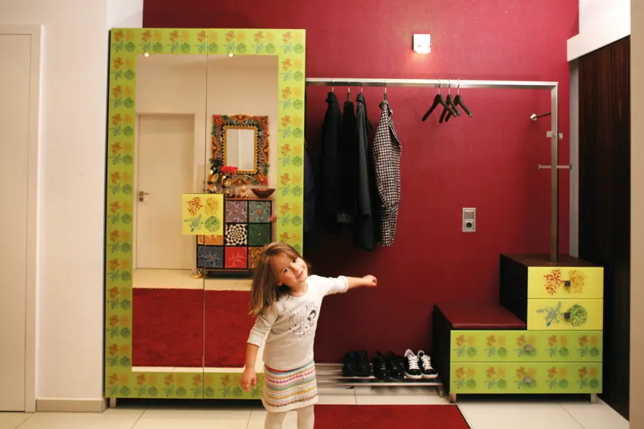 Zur bald zu erwartenden Partyzeit (die Große ist schon Acht) bietet die ebenfalls mit vielen Haken ausgestattete Rückseite noch viel mehr Jacken Platz. Die Leuchte ist von Domus, die Eiche aus Reichenschwand.
