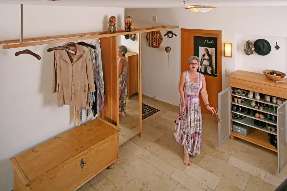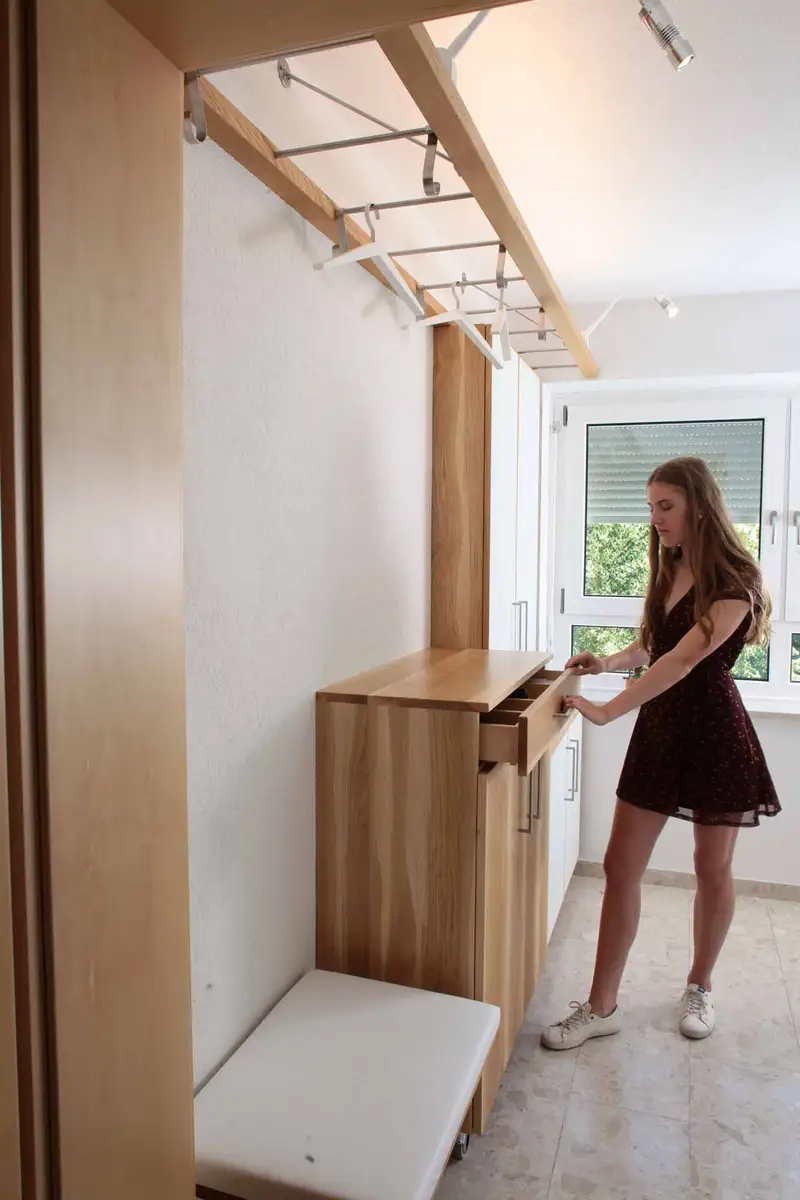 Im Gang zwischen Arbeitszimmer und Bad fand ein Trampolin einen Spezialplatz im Schrank. Unter der Schublade für Medikamente (sollte mit dem Trampolin mal was schief gehen) kann man dank raffinierter Beschlaglösung auch noch Kleidungsstücke für den Sport abhängen.
