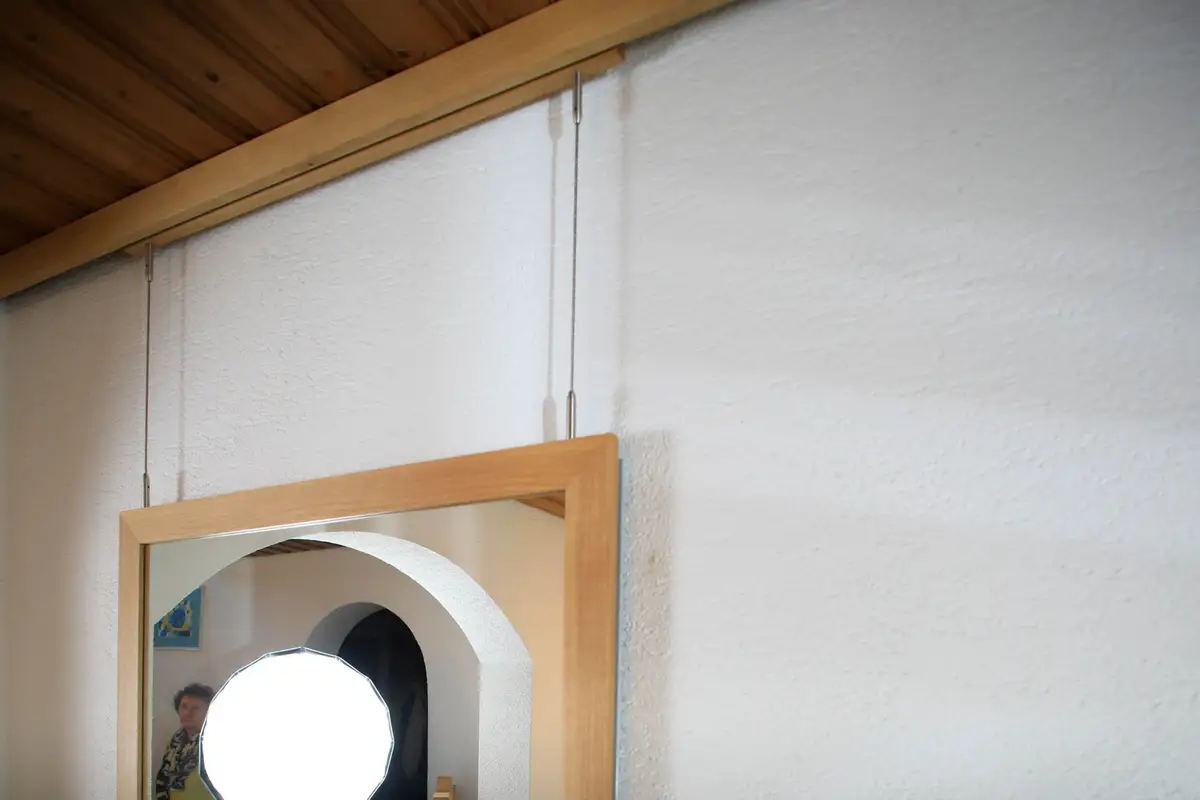Der Spiegel hängt stabil mit zwei Stäben an einer in der Schiene verschiebbaren Leiste