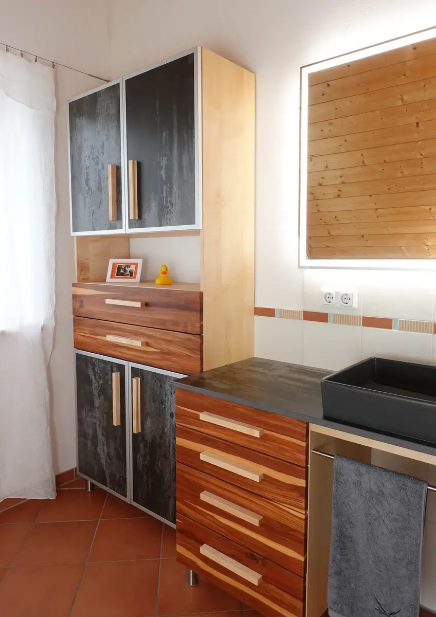 Eiche massiv, Grifffräsung und Keramik im industrial Design