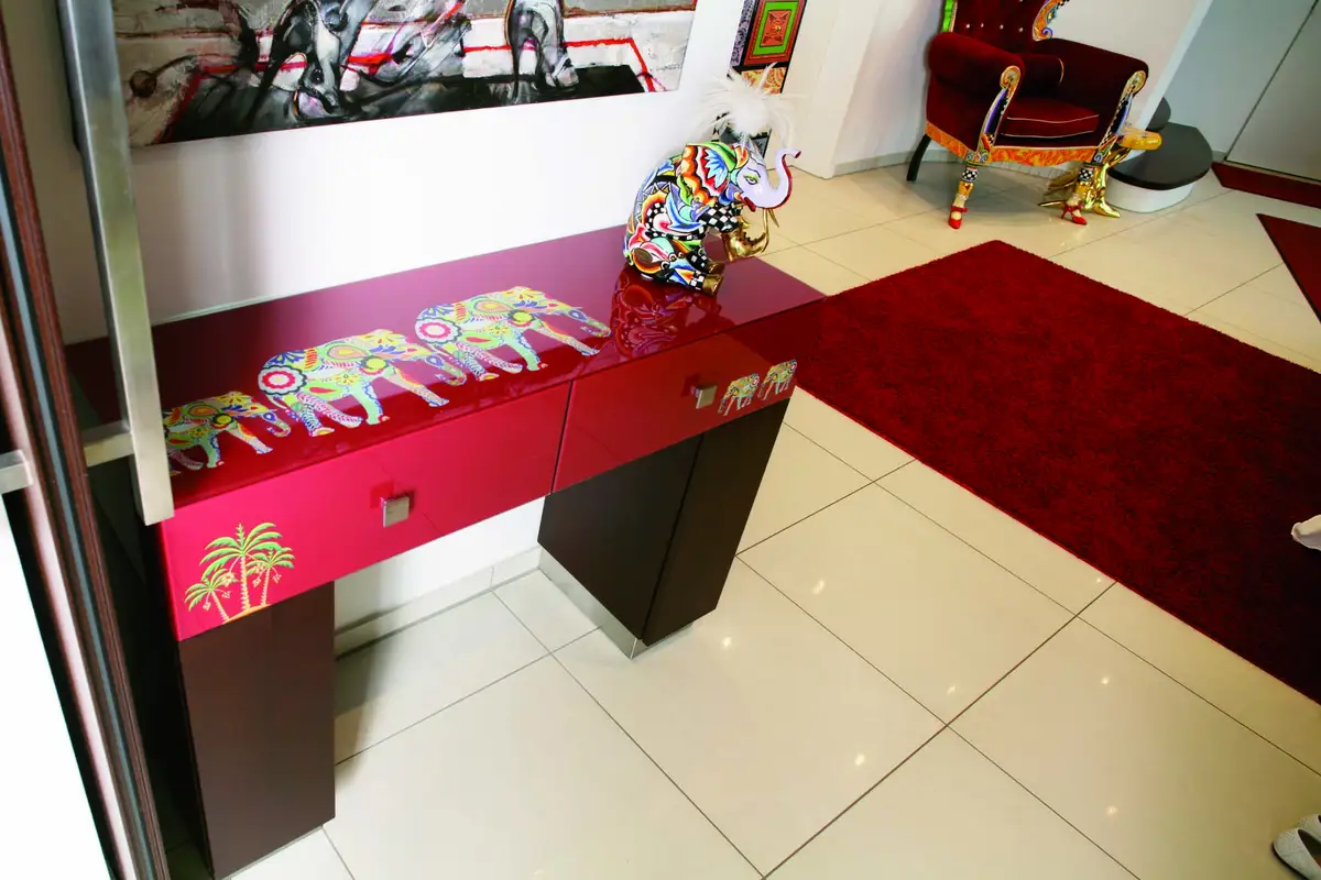Elefantendruck hinter Glas als Flurmöbel in Thermobuche
