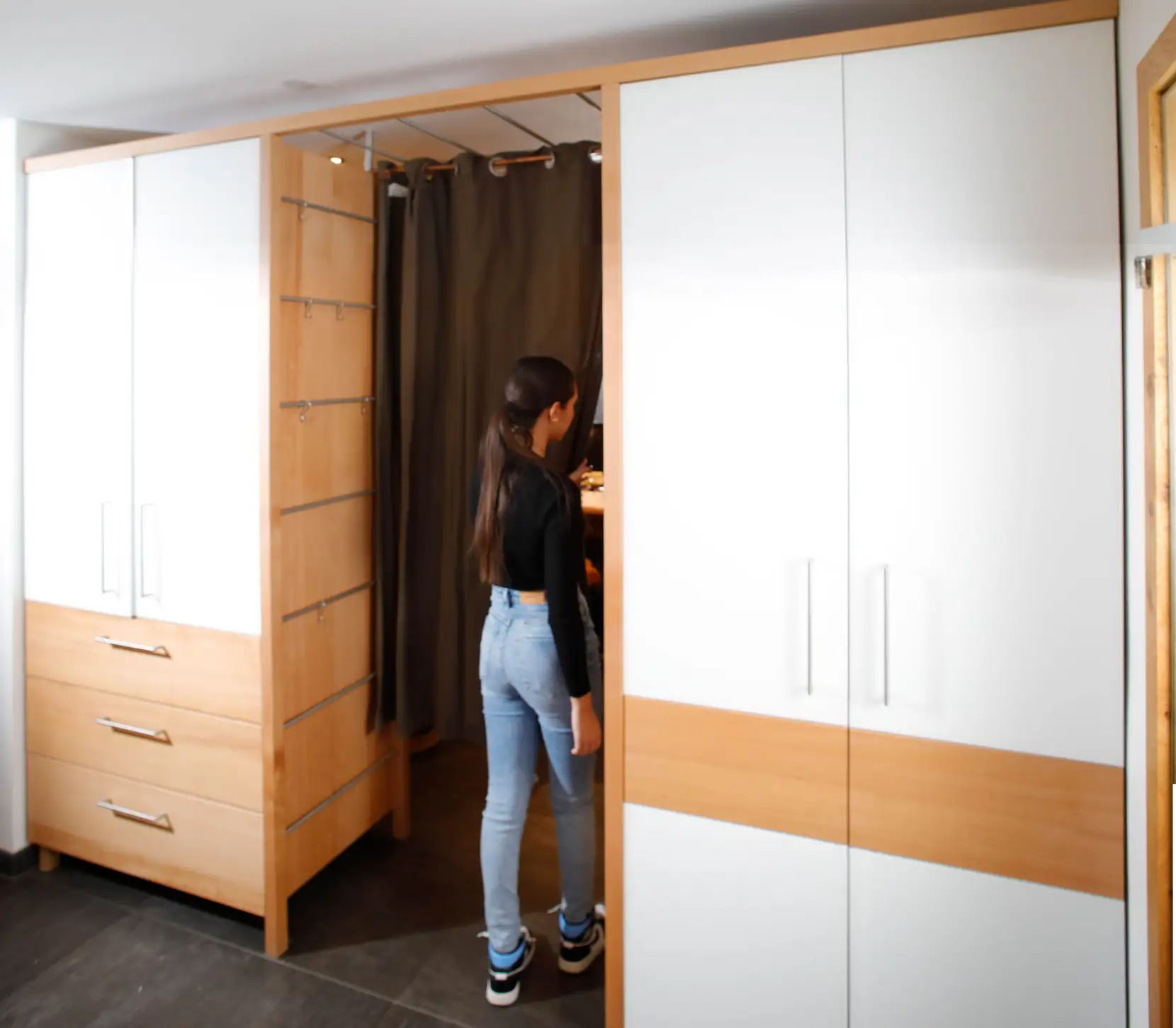 Der Schrank hat nur eine Tür für Schuhe links, rechts verbirgt er die seitliche Bedienbarkeit, die durch die Edelstahlhängemöglichkeit und die Schubladen mit Sitzmöglichkeit ergänzt wird.