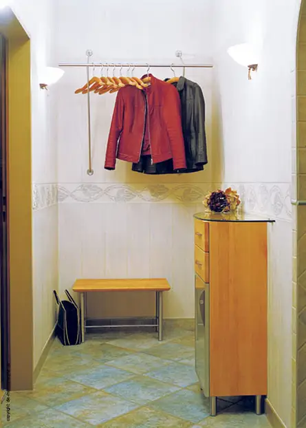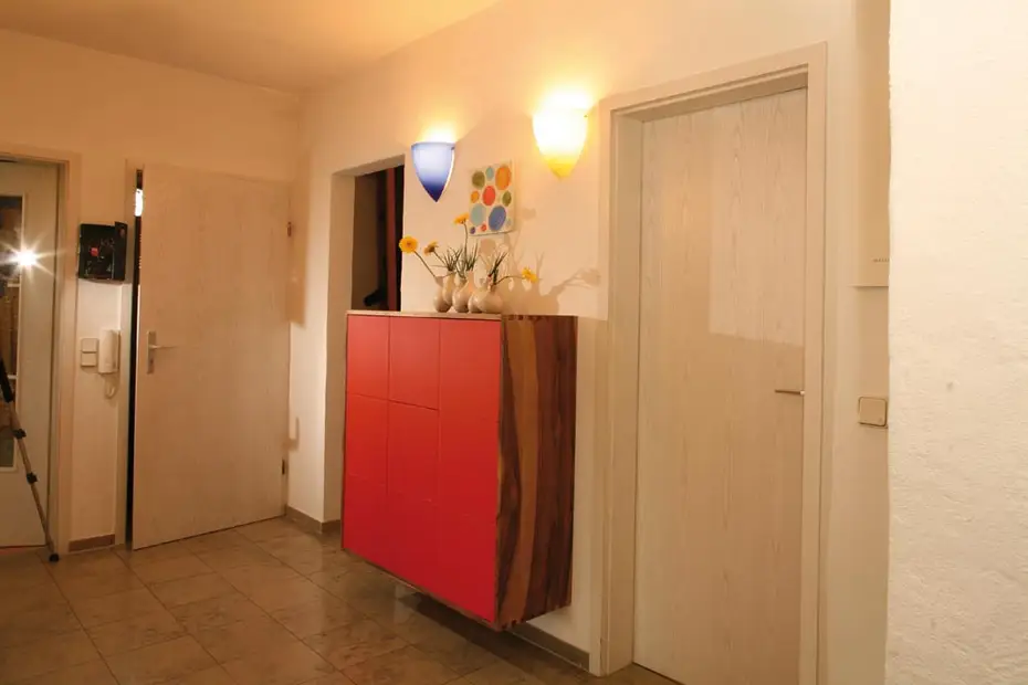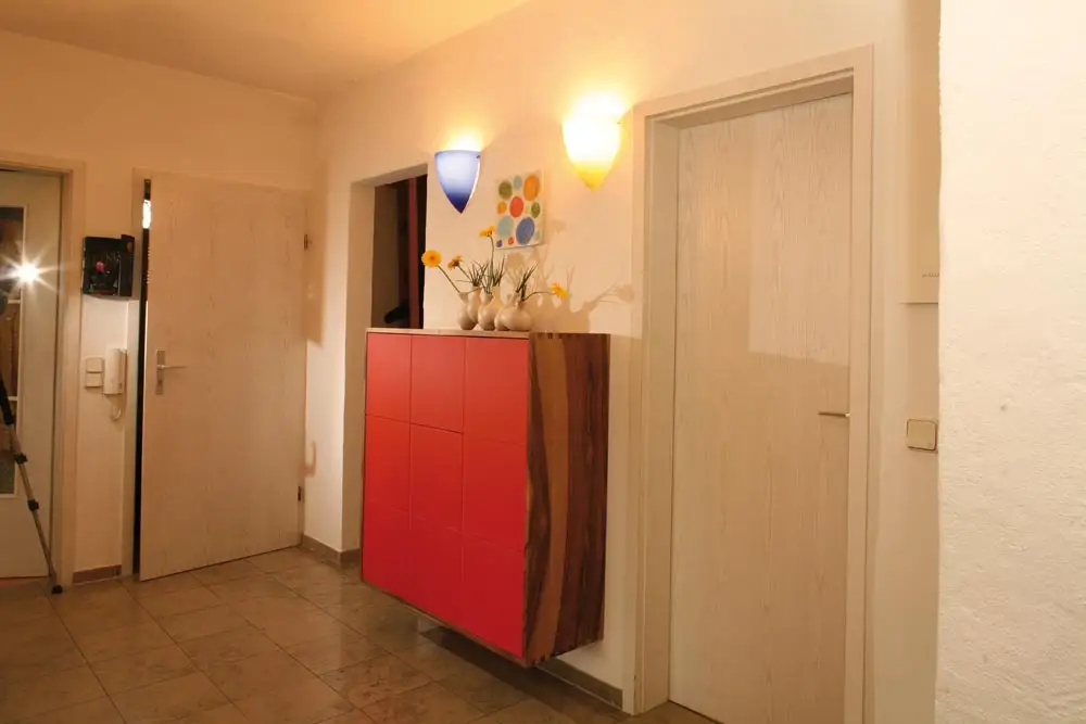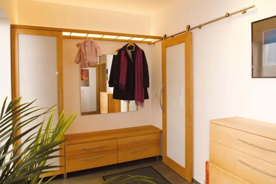 Die farblich passende Lackierung übernahm Michael Brendel (Beispiel ganz unten). Das mittlere Element ist eine Schiebetür, links und rechts ist die Garderobe platzsparend von der Seite aus zugänglich.