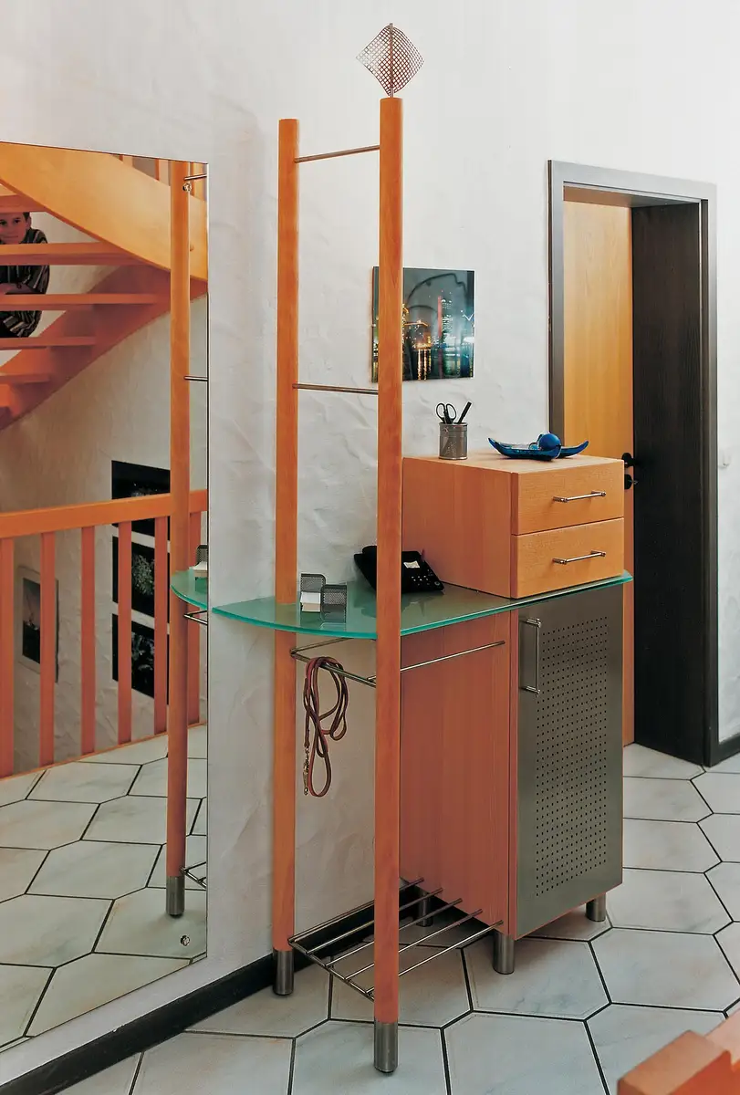 Garderobe und Kommode in Buche mit viel Glas und Edelstahl