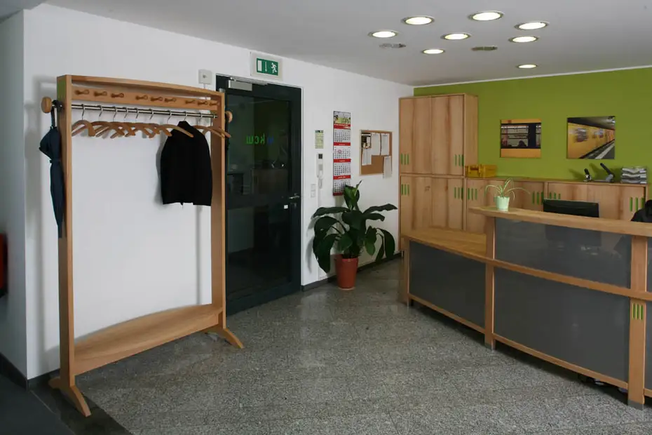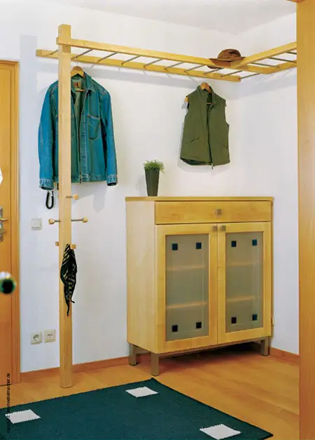 Diese Garderobe ist aus Buche und die Kleiderbügel von Pieper.