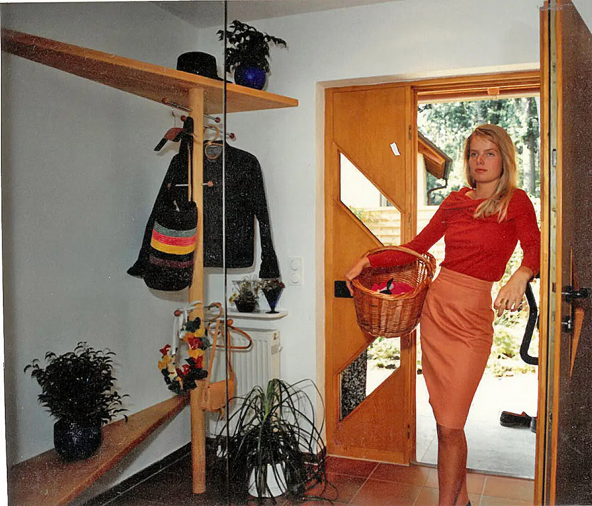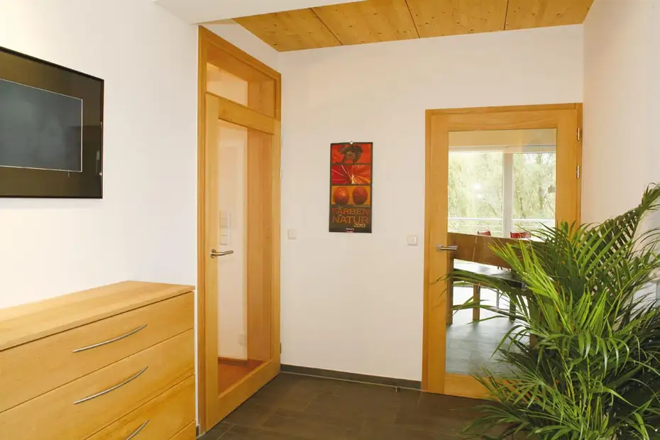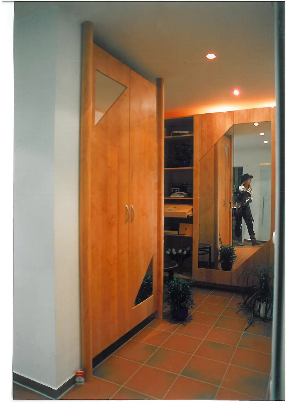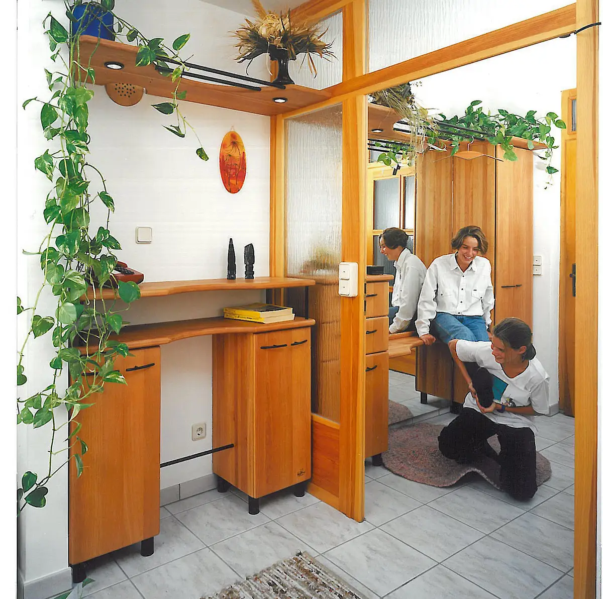 Sybille Köhlerschmidt - bekannt durch Ihre schöne Buchenküche - begleitete Jürgen Wahner erfolgreich als Geschmacksverstärker bei der Garderobenplanung in Unterkrumbach. Der rote Kern der Buche wurde eindrucksvoll in Szene gesetzt, aber wichtiger ist der aufgeräumte Eindruck durch den türlosen seitlichen Zugriff. Die Formensprache der Glasfront wurde auch im Garderobenschrank gegenüben in Holz aufgenommen.