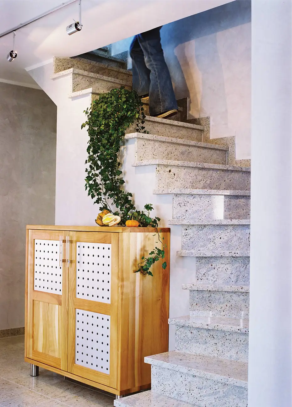 Selbst wenn sie nur ins Dachgeschoss führt, harmoniert die schlichte Treppe aus Edelstahl und Massivholz mit der funktionalen Garderobe, die wiederum die Gestaltung der Haustüre aufnimmt. Komplettservice!