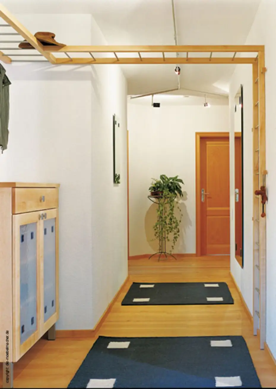Leitersprossen als Garderobe und kleine Teppiche in gleichem Design wie Schrank
