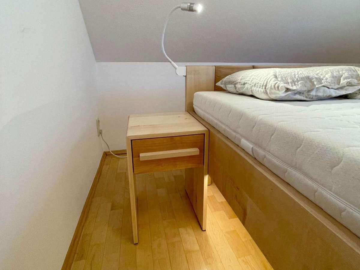Das Nachtkästchen dockt sich mit Magneten genau an der richtigen Stelle an das Bett an, die Leuchte ist im Betthaupt verlegt