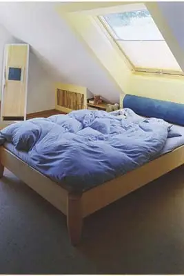 Gerdi Gennrichs neues Schlafzimmer: aus rotkerniger Buche, mit Scheiben von Elgin Kriegisch, Leuchten von Domus, Strickleiter, Wäschepuff mit grünem Nubukleder von Ecopell, Hifianlage, DVD-Player und Fernseher von Sharp, Fußboden aus Buche thermo-behandelt