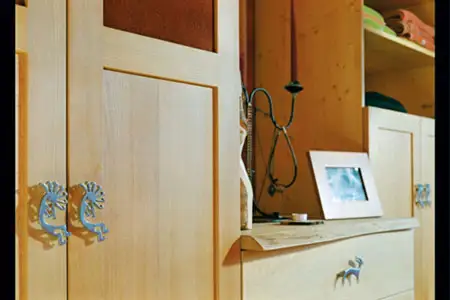 Das Schlafzimmer aus rotkerniger Buche hat dekorierte Scheiben von Elgin Design. Elgin Kriegisch schneidet die farbigen Gläser zu, klebt sie auf und mailt ein Foto zur Abnahme, bevor sie die Scheiben in den Ofen schiebt und das Glas aufschmilzt.