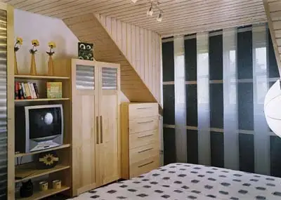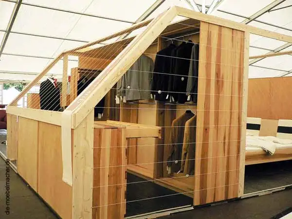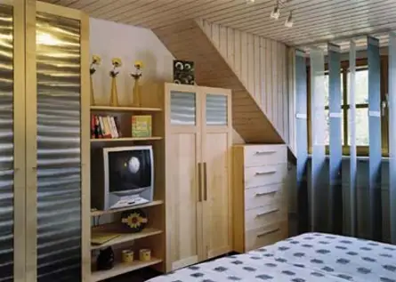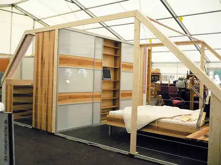 Gunther Münzenbergs geniale Umsetzung der Dachgeschossoptik durch Leisten und Schnüre merkt man seine Erfahrungen als Messebauer deutlich an. Zusammen mit den Anzügen von Creátion Gross wurde das Zimmer aus Elsbeere zum echten Hingucker und wer Fußball lieber im Bett schaut, weil man da mit geschlossenen Augen mitdenken kann, bekommt dafür auch ein passendes Modell von Sharp.