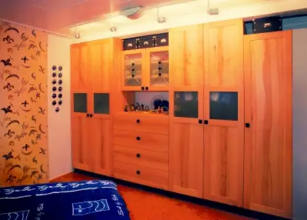 Schlafzimmerschränke aus braunkerniger Esche, die Gläser wurden in Fusingtechnik dekoriert, das Bett ist aus lebhaften Spitzahorn.