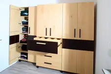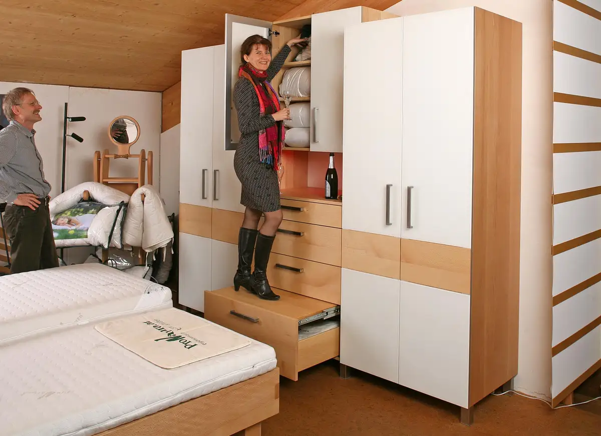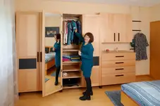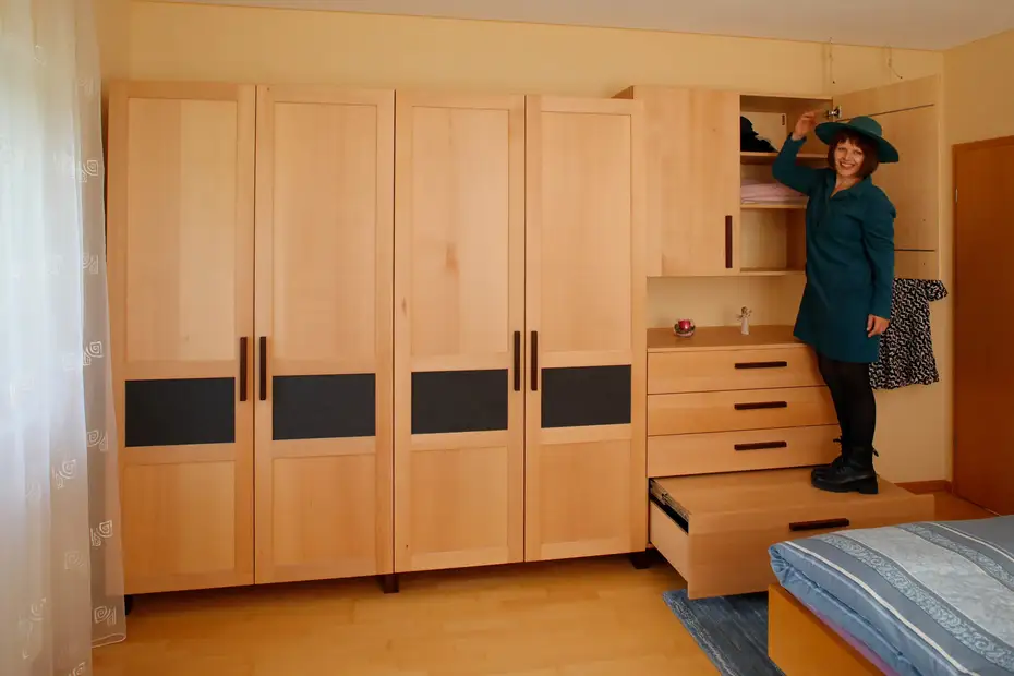 Maß gefertigt wurden. Die Trittstufe ist innerhalb der unteren Schublade integriert und ermöglicht auch kleineren Menschen das Erreichen des höchsten Levels. Der auf der Innenseite der Tür montierte Spiegel ist dank der weitwinkelig zu öffnenden Tür sehr praktisch zum Betrachten des Anziehergebnisses.