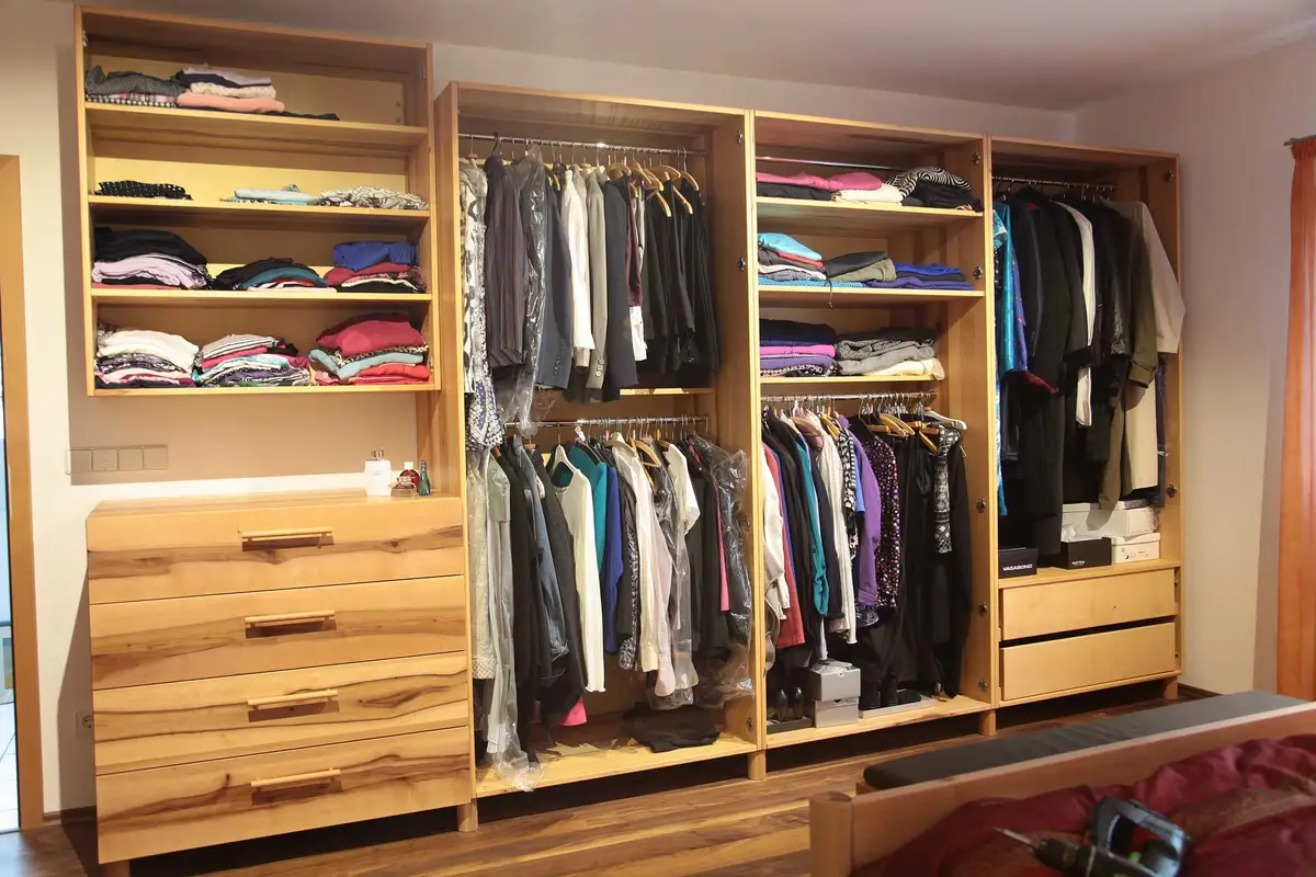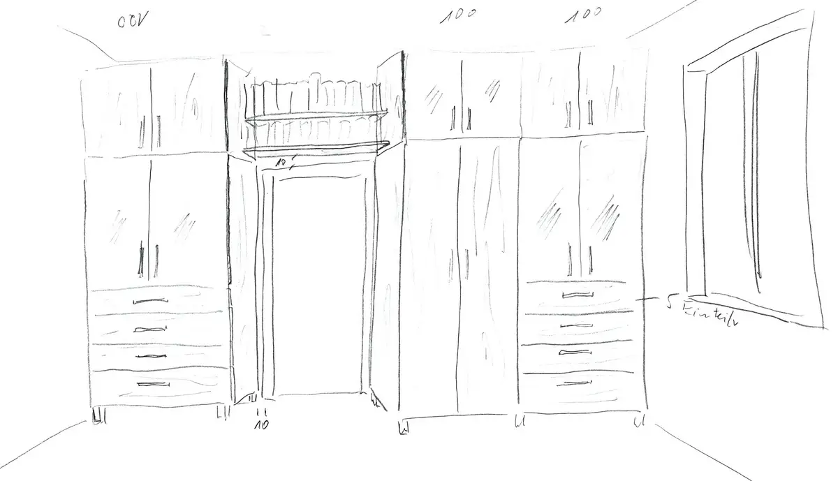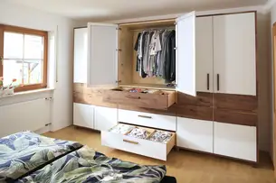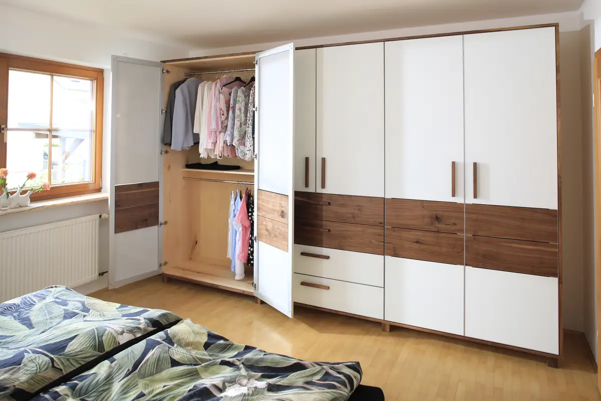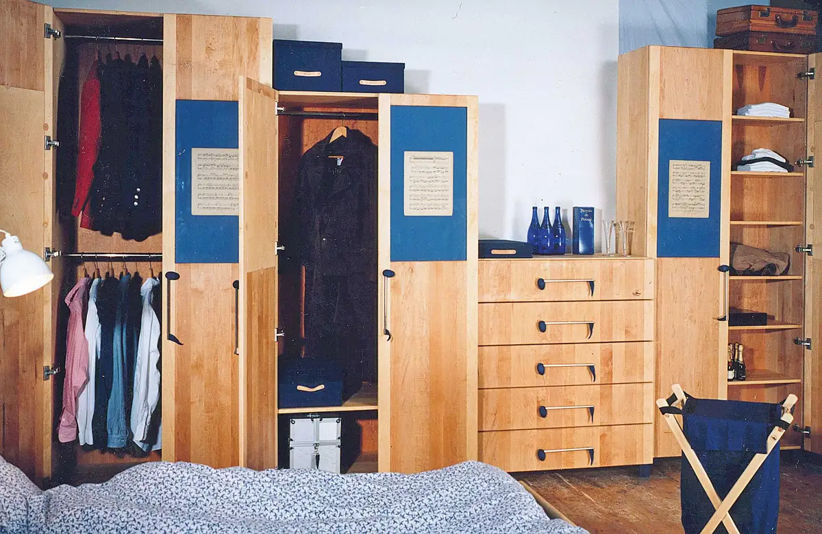 Unsere Schlafzimmerschränke haben meist eigene Korpusse, sodass man sie anderswo auch ganz anders aufstellen kann. Als Superservice können Sie dieses Schlafzimmer mal ganz intim ohne Türen sehen (weil die Kunden sehr ordentlich sind).