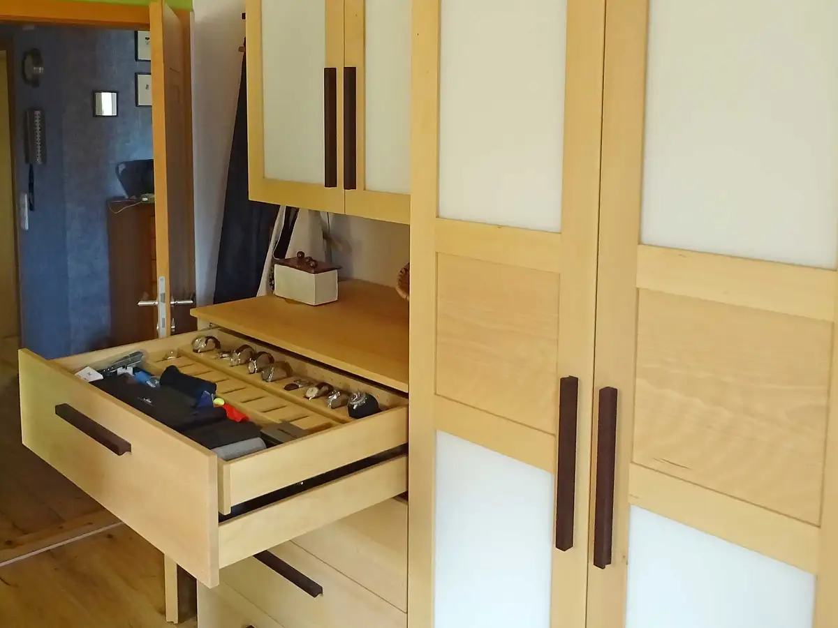 Viel kleiner können Schlafzimmer nicht mehr werden und besonders schade war es, dass die Eingangstür keine 60 cm Abstand zur Ecke hatte. Aber wir haben das Beste draus gemacht und jetzt erfreut das Schlafzimmer aus extrem sauberer Buche nebst Thermobuche durch seine optimierte Inneneinrichtung. Im linken – weniger tiefen – Schrank nur Fachböden, im mittleren Hängen und Schübe (wegen des breiten Querbrettes ist hinter der breiten Blende noch ein Innenschub versteckt) und ganz rechts doppelt hängen mit Spiegel. Den kann man dank der 170 Grad-Bänder auch ganz öffnen, aber dann hätte er verraten, dass die Sonne nur meine LED Leuchte ist.