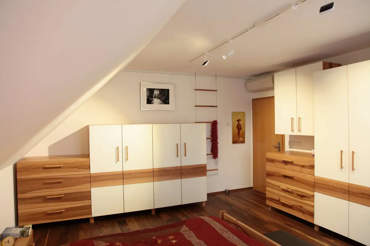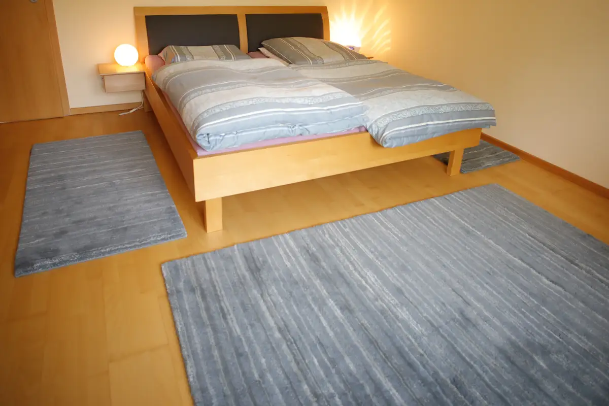 Schlafzimmer in Buche mit Trittstufe, Strickleider und Teppichen