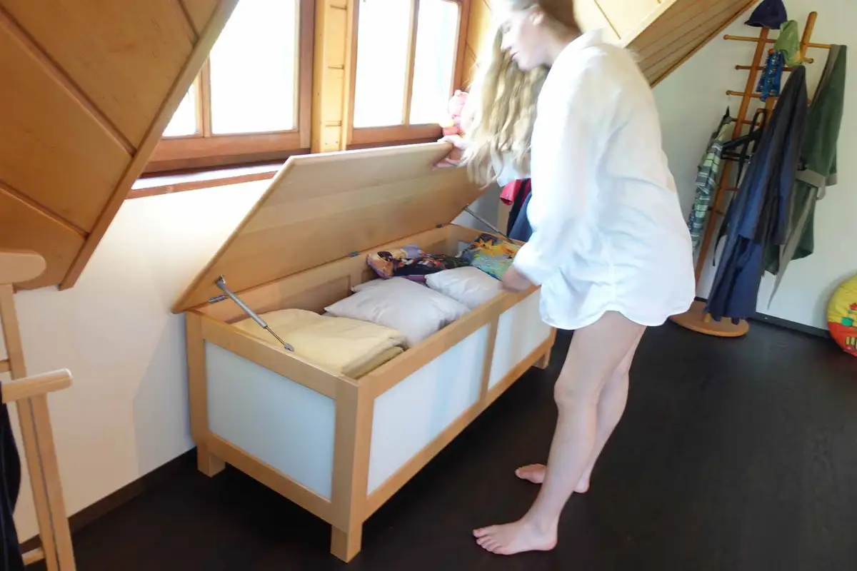 Die Truhe ist als Möbel kaum noch anzutreffen, denn sie nervt. Man hat immer eine Menge Zeug drauf liegen und wenn man rein will, muss man erstmal abräumen. Das ist aber beim Wechsel zwischen Sommer- und Winterzudecke überschaubar, weil nur zwei Mal im Jahr. Um der Gefährdung durch herunterfallende Deckel zuvorzukommen, haben wir eine Gasdruckfeder eingebaut, die auch bei diesem archaischen Möbel eine moderne Bedienung ermöblicht. Möbel, Türen und Truhe haben eine weiße Füllung aus Glas. Über dem Bett sind die passenden Sternzeichen der Darunterliegenden eingebaut.