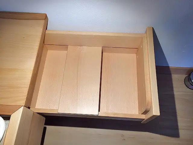 Fachböden links und Innenschublade hinter der überbreiten Schubladenblende in der Mitte