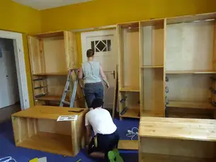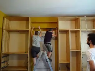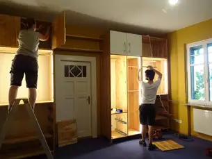 - den Holzfußboden verlegt und die Türen gefertigt und eingebaut und