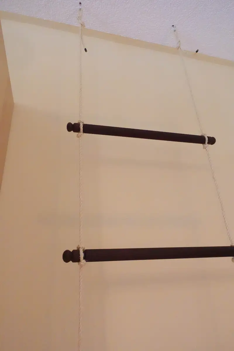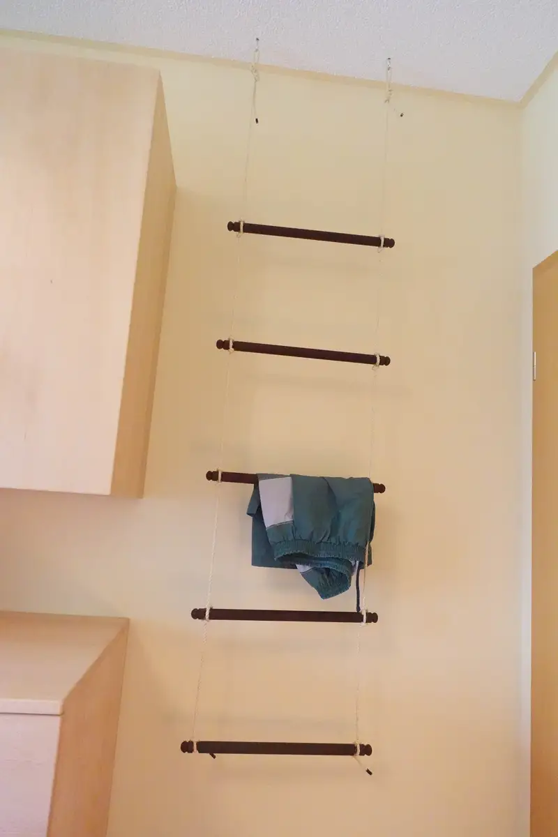 Die Strickleiter verwenden wir gerne hinter den Türen als stummen Diener zum Auslüften oder zur Kurzablage von Klamotten