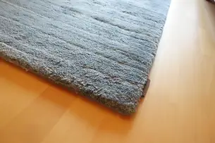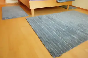 Dieser Teppich Cascade von Kinnasand ist aus Schafschurwolle, Leinen und Seide und fasst sich so gut an, dass man sich fast drauflegen würde, aber das ProNaturabett ist natürlich noch bequemer
