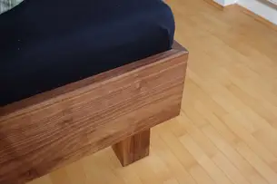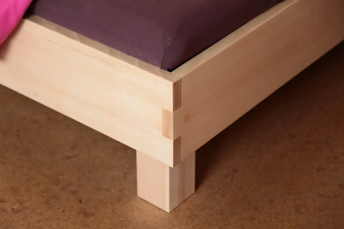Optische und handwerkliche Besonderheit: Gezinkte Eckverbindung des Massivholzbettes