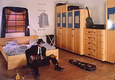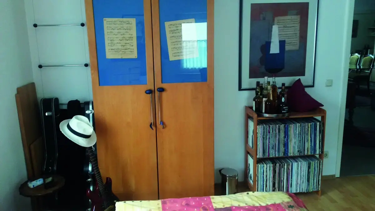 Bei Bamberg steht dieses Schlafzimmer mit Glas-Nussbaumfronten und Ahornkorpus. Das Bett hat ein eingebautes, ledergepolstertes Kopfteil und freistehende Nachtkästchen. Im Video sind alle Details zu sehen und die neunjährige Julia präsentiert sich als Nachfolgerin von Ian Anderson (Jethro Tull).