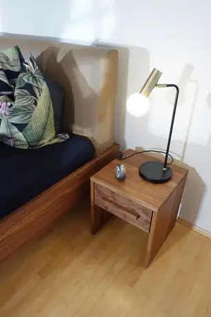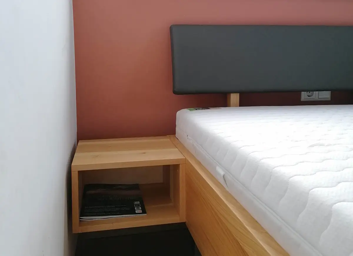 Unsere Möbel werden mit unseren Kunden bei einem gemeinsamen Gespräch geplant, über Rundungen, Kanten, Füße und Nachtkästchen, wie bei diesem Elsbeerenbett (das Wertvollste, was Franken zu bieten hat). Auch das Bettsystem von Pro Natura lässt sich durch die Kombination von Einlegerahmen (auch in elektrischer Variante möglich), Federelementen und Matratzen perfekt auf unsere Kunden abstimmen. Dazu passend ein am Bett montiertes Nachtkästchen.